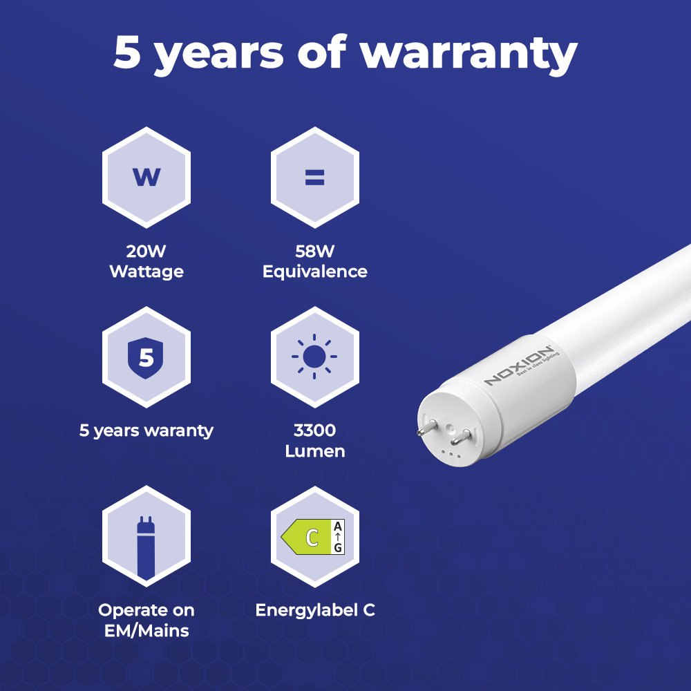 Die T8 LED-Röhre von Noxion kann nicht nur mit einer langen Lebensdauer von 50000 Stunden, sondern auch mit einer hohen Lumeneffizienz von lm/W überzeugen. Sie strahlt ihr Licht in der Farbtemperatur 3000K – Warmweiß aus und wird mit betrieben. Im Preis ist zudem eine All-In-Garantie von 5 Jahre Jahren enthalten.