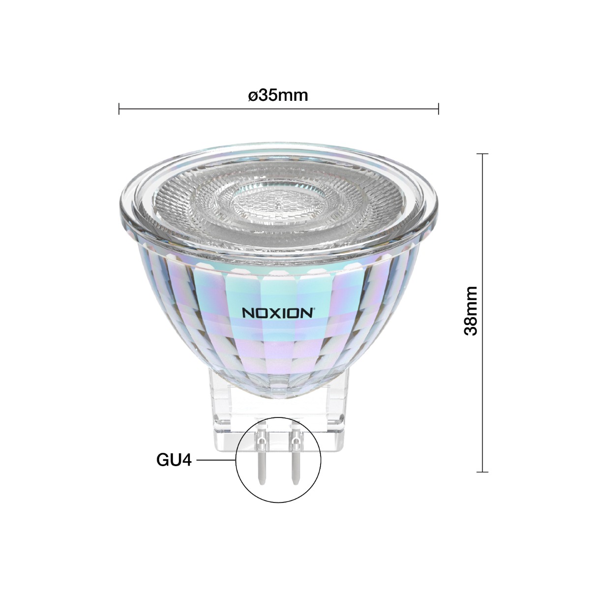 Die Noxion LED-Spot GU4 MR11 4.5W 345lm 36D – 927 Extra Warmweiß | Höchste Farbwiedergabe – Ersatz Für 35W ist eine effiziente GU4 LED-Lampe und der perfekte Ersatz für Ihre konventionelle Halogenlampe mit 35W und einem GU4-Sockel, bei welchem die beiden Stifte einen Abstand von 4 mm zueinander haben. Die Stifte haben einen Abstand von 4 mm. Die Abkürzung MR11 steht für den Reflektordurchmesser von ca. 3,5 cm. Zudem strahlt das Produkt Licht in der Farbtemperatur aus und punktet durch eine lange Lebensdauer.