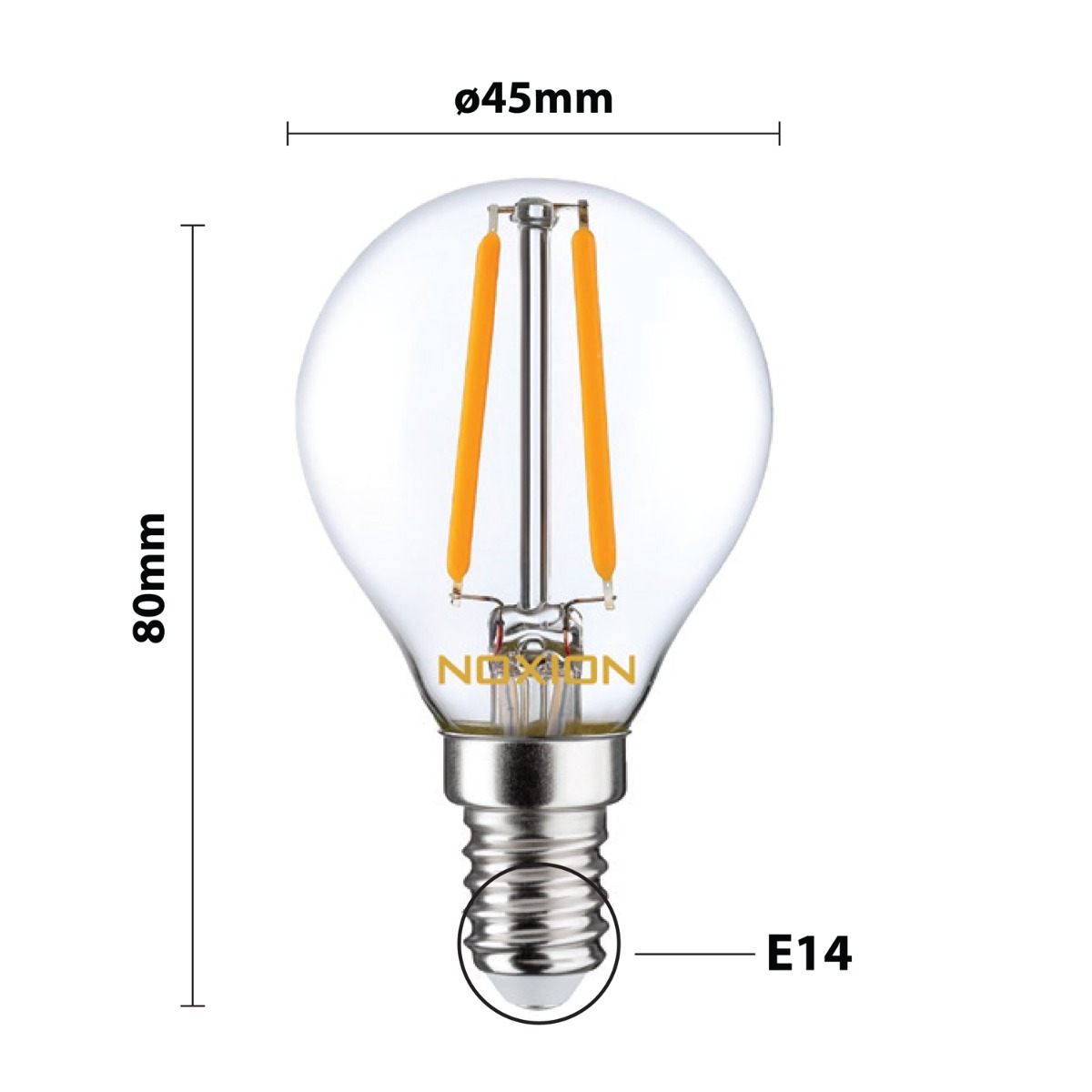 | Herstellername | Noxion Lucent Filament LED Lustre P45 E14 220-240V 2.5W 250LM CRI80 2700K NON-DIM (25W eqv.) |